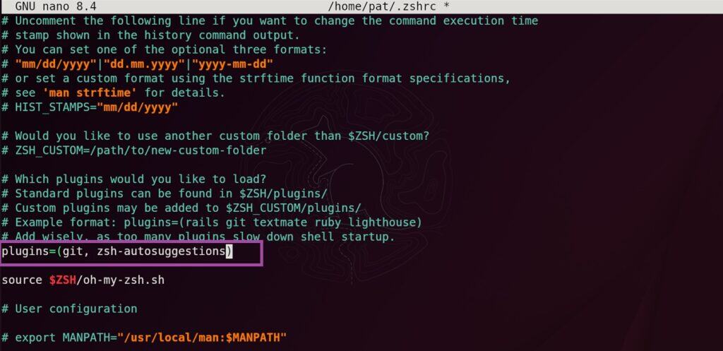 Now follow the same procedure as before and edit the ~/.zshrc file to add this plugin as well.