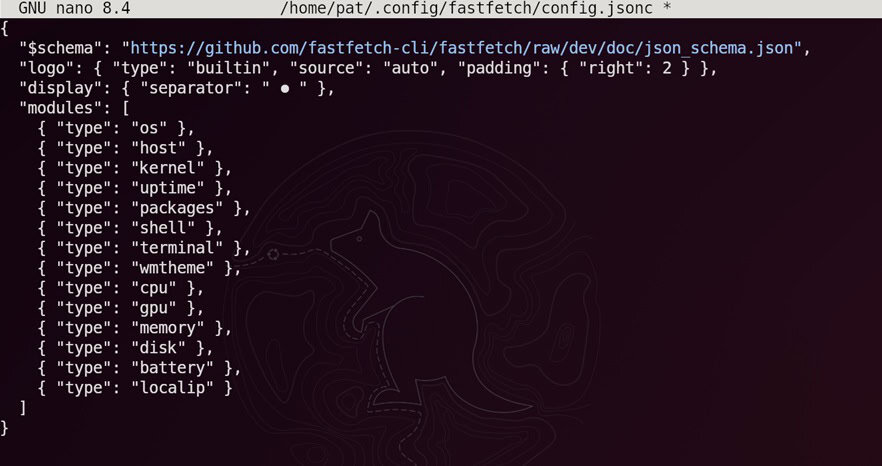 This command will generate a default configuration at ~/.config/fastfetch/config.jsonc. You can open and edit it as you prefer. I edited my configuration as shown below: