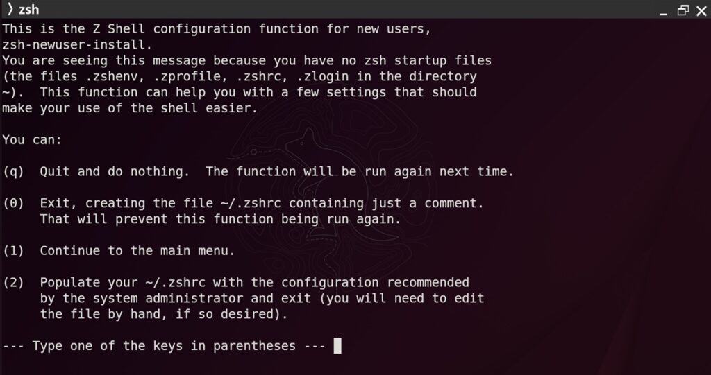 You can opt to customize your Zsh setup using this menu. However, since we plan to use a custom framework and theme (which will override these configurations), we chose 0.