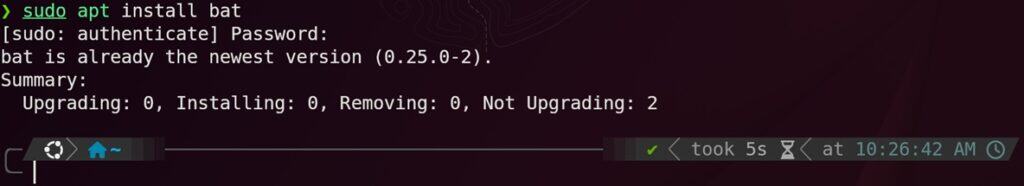 You can install bat using the command:sudo apt install bat
