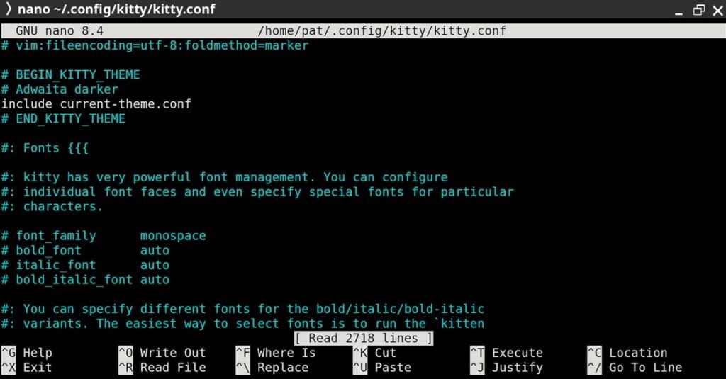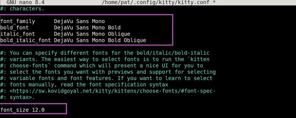 Next, we need to change the font used in our terminal emulator. For this, we need to manually make changes to the configuration files. To do so, open ~/.config/kitty/kitty.conf in any text editor (e.g., Nano).