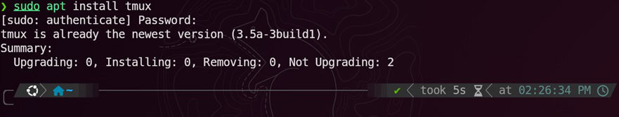 You can install tmux using the command:sudo apt install tmux